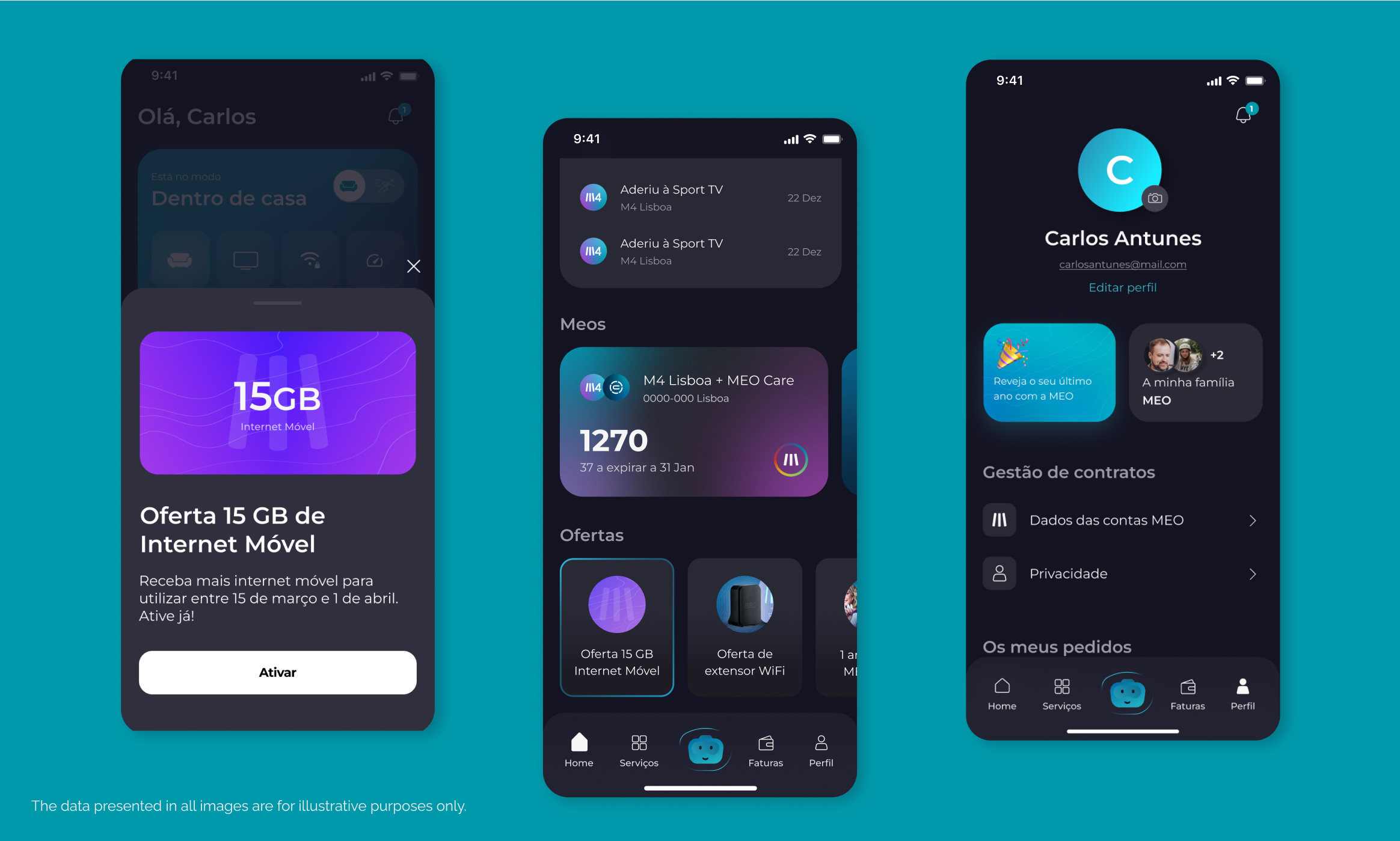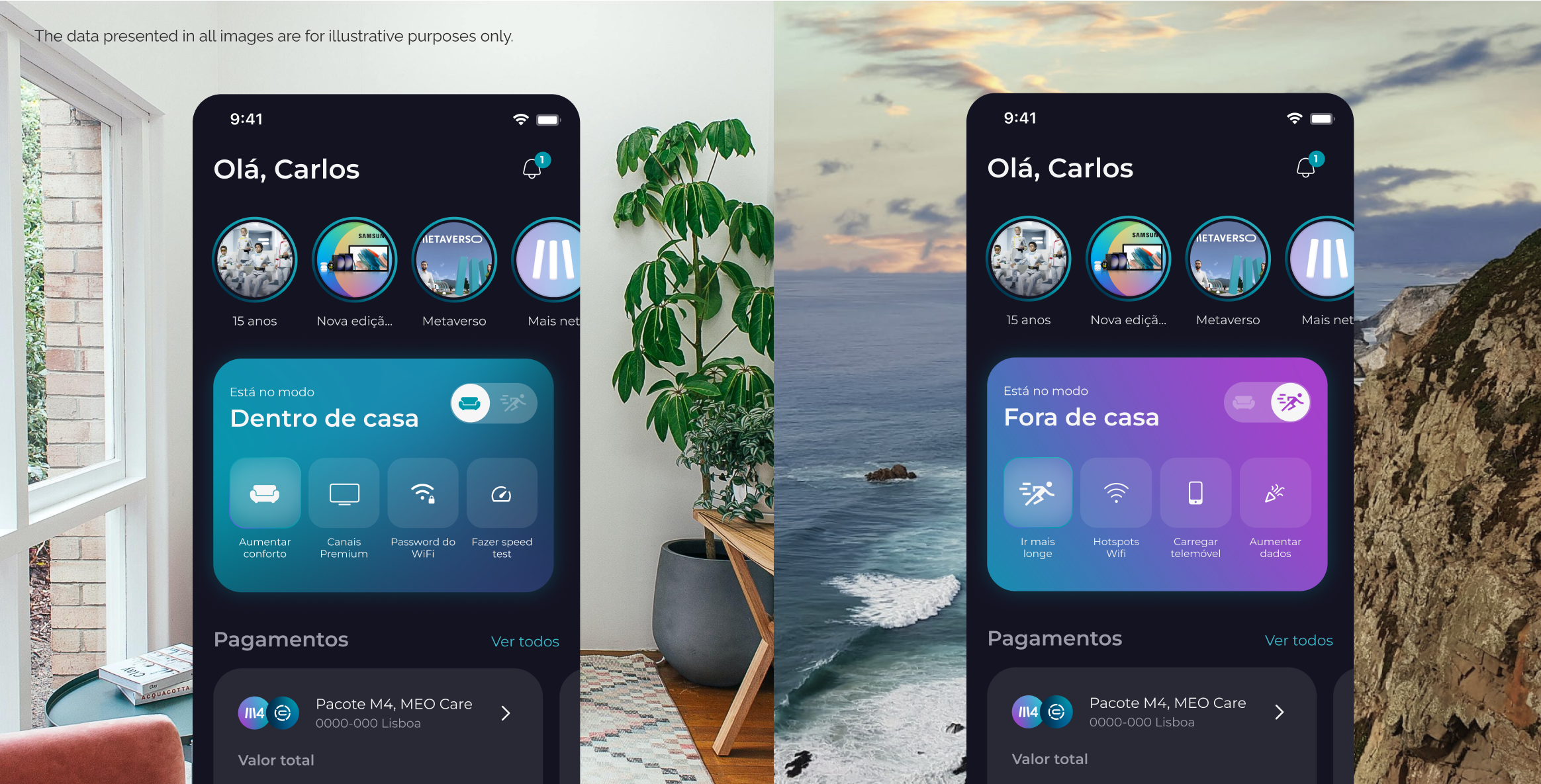 On the app’s home page, clients can have an overview of all information related to their MEO services, like the state of their invoices and the progress of mobile data consumption. Also, they can access personalized features from the home page according to their location. If users are at home, the “indoor mode” is activated, and they can, for example, use the WiFi speed test. If on the street, the “outdoor mode” lets users use MEO GO to watch TV.